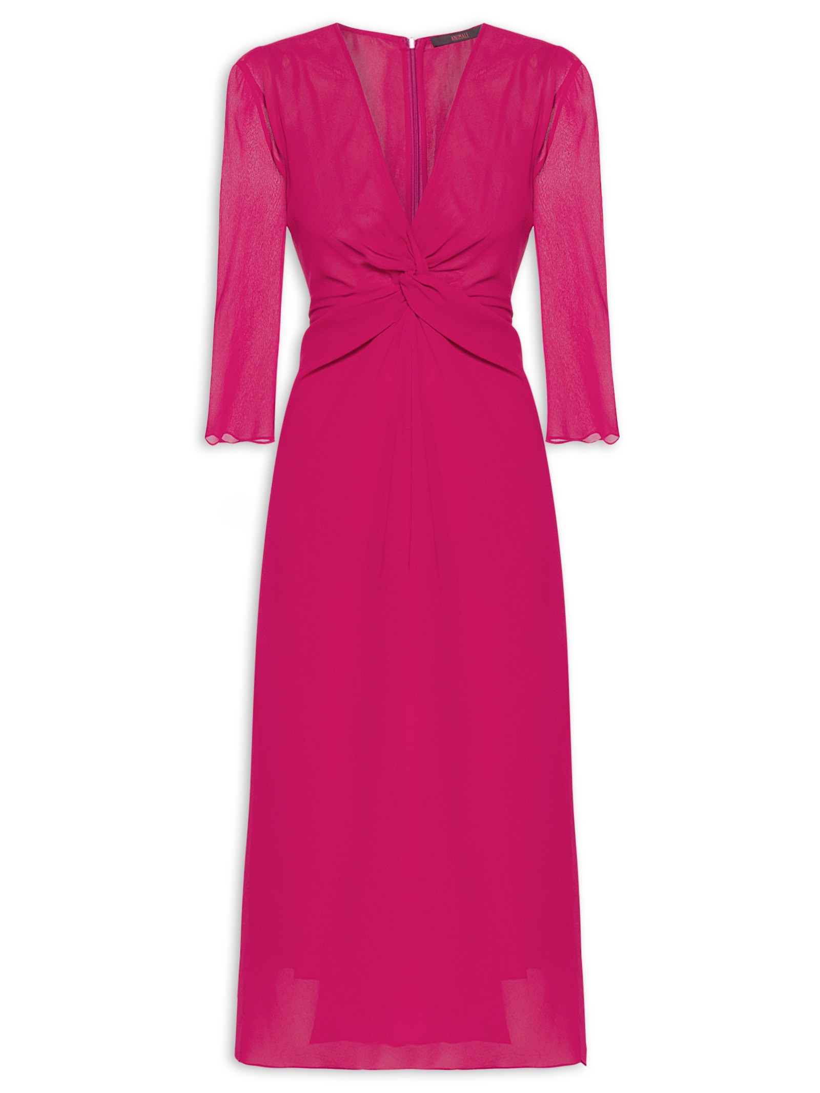 O vestido rosa é confeccionado em tecido leve sem elasticidade. A peça solta ao corpo possui decote V com detalhe de nó transpassado, mangas 7/8, recorte posterior na altura da cintura com efeito franzido, forro, recorte com fenda na parte frontal, comprimento midi e fechamento posterior por zíper.