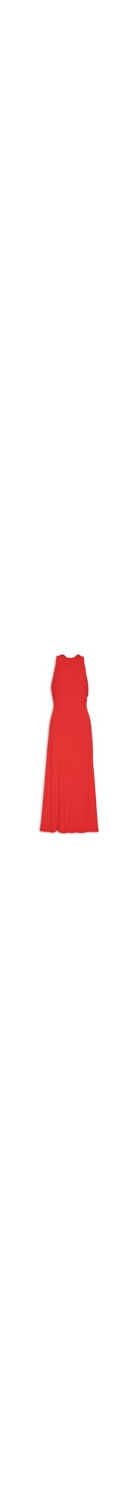 O vestido vermelho é confeccionado em malha encorpada com superfície texturizada e média elasticidade. A peça justa na altura do busto e da cintura e solta no comprimento possui decote redondo, alças largas cruzadas na parte posterior, recorte posterior vazado, sem bojo, comprimento midi e não possui fechamento.