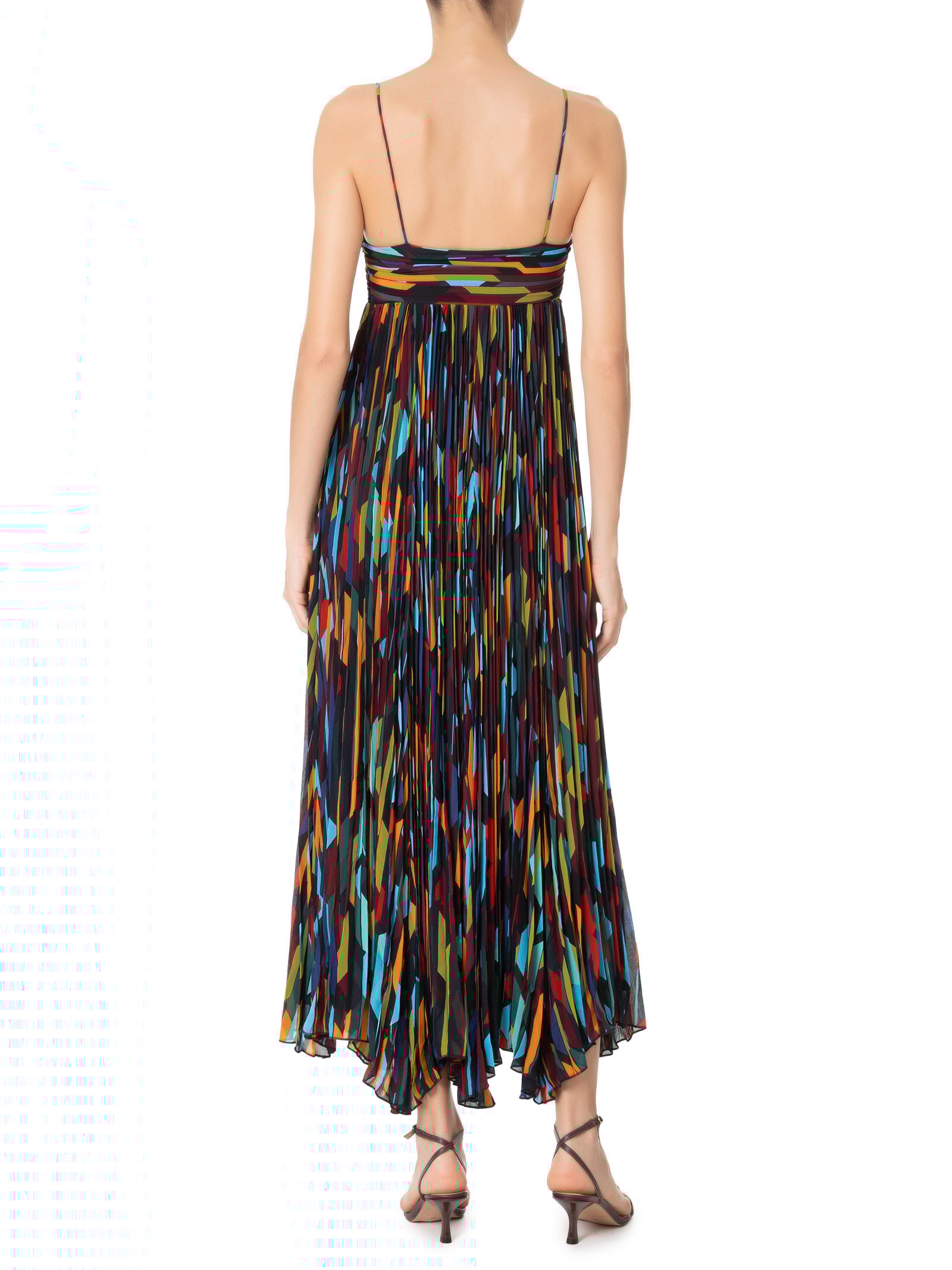 O vestido preto é confeccionado em tecido leve sem elasticidade. A peça solta ao corpo possui decote reto, alças finas, recortes, efeito plissado, barra assimétrica, padronagem geométrica em cores contrastantes, comprimento midi e fechamento lateral por zíper invisível.
