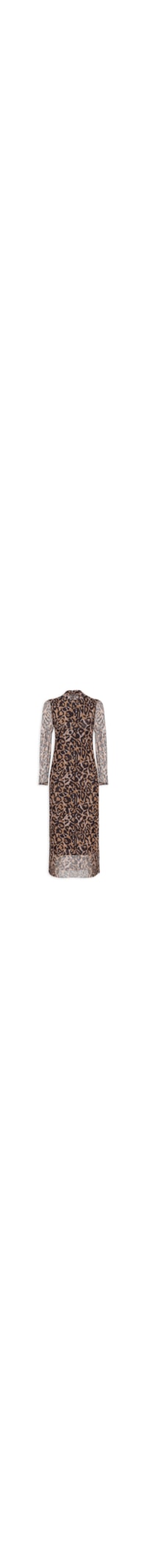 O vestido animal print é confeccionado em tule de alta elasticidade. A peça solta ao corpo possui gola alta, mangas longas, barra com acabamento em corte a fio, transparência, forro e comprimento midi.