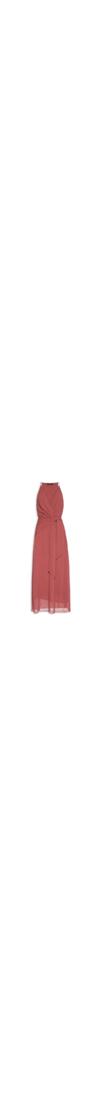 O vestido vermelho é confeccionado em tecido leve sem elasticidade. A peça solta ao corpo possui decote em V profundo com fechamento por botão de pressão, alças finas, detalhe franzido com efeito drapeado no busto, tecido sobreposto a parte posterior com tiras alongadas aplicadas para amarração frontal, forro e comprimento midi.