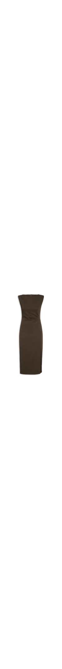 O vestido marrom é confeccionado em tecido leve com média elasticidade. A peça solta ao corpo possui decote canoa, alças largas, drapeado frontal, recortes frontais e posteriores, pences posteriores, fenda lateral, comprimento midi e fechamento posterior por zíper invisível.