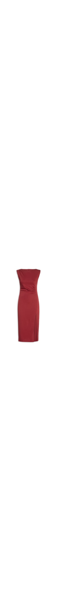 O vestido vermelho é confeccionado em tecido leve com média elasticidade. A peça solta ao corpo possui decote canoa, alças largas, drapeado frontal, recortes frontais e posteriores, pences posteriores, fenda lateral, comprimento midi e fechamento posterior por zíper invisível.