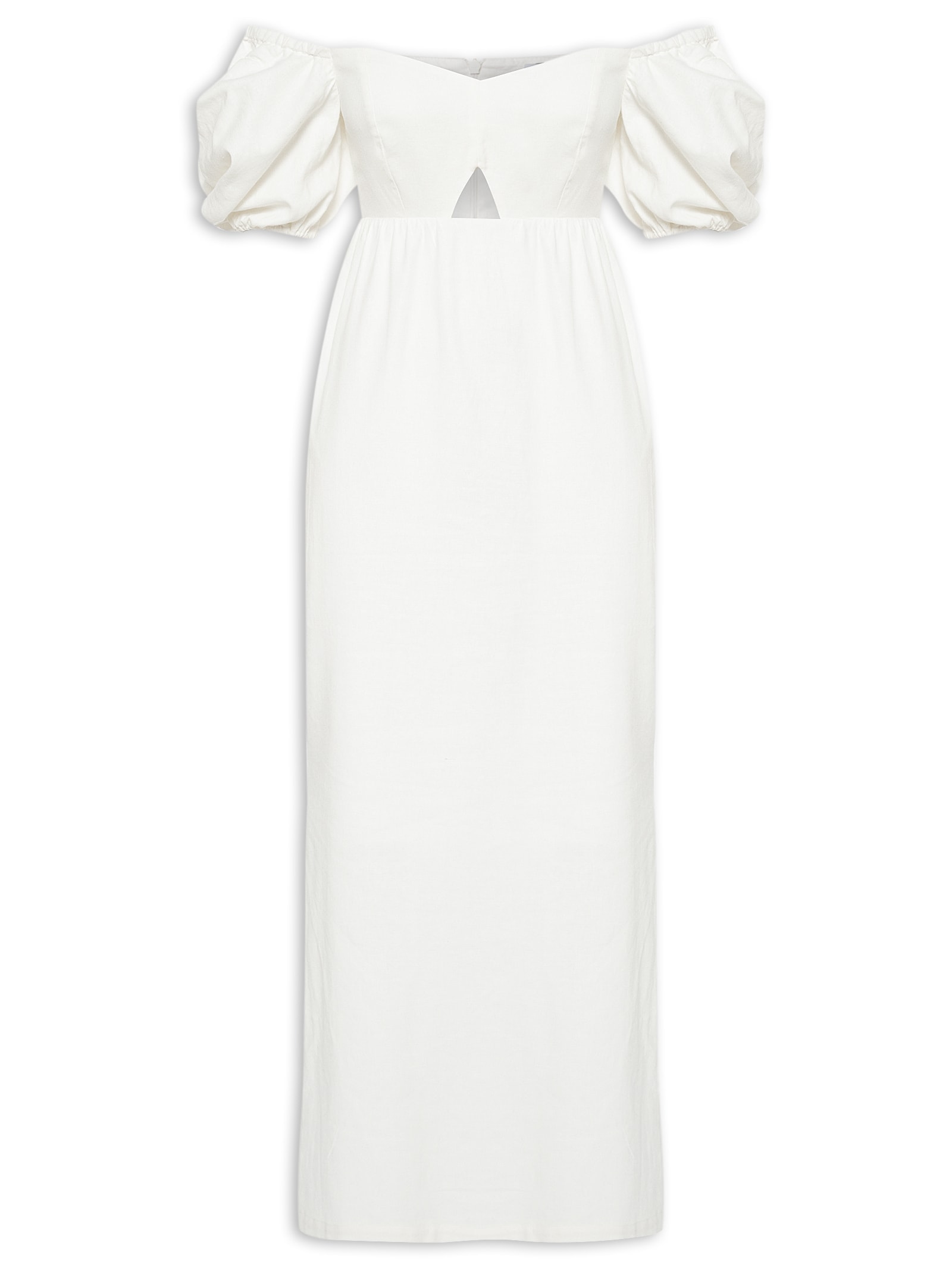 O vestido off white é confeccionado em tecido leve com toque de linho com baixa elasticidade. A peça justa na altura do busto e da cintura e solta no comprimento possui decote coração, mangas curtas bufantes com franzidos, recortes posteriores e frontais, detalhe de franzidos na parte frontal na altura da cintura, sem bojo, recorte frontal vazado, fendas laterais, forro, comprimento midi e fechamento posterior por zíper invisível.