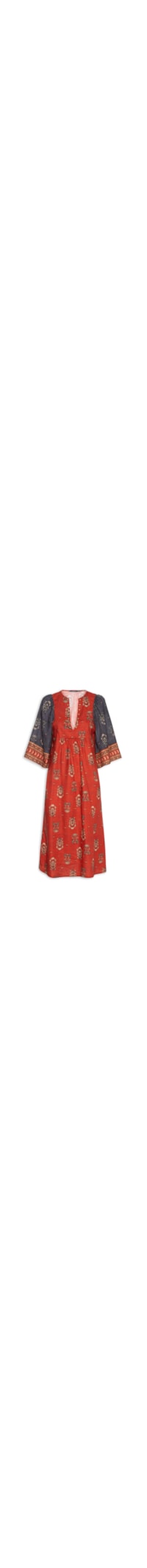 O vestido vermelho é confeccionado em tecido leve sem elasticidade. A peça solta ao corpo possui decote V com aplicação de tachas metálicas, mangas curtas e amplas com recorte na cor azul marinho, recorte frontal na altura da cintura com efeito franzido, mix de estampas em cores contrastantes e comprimento midi.