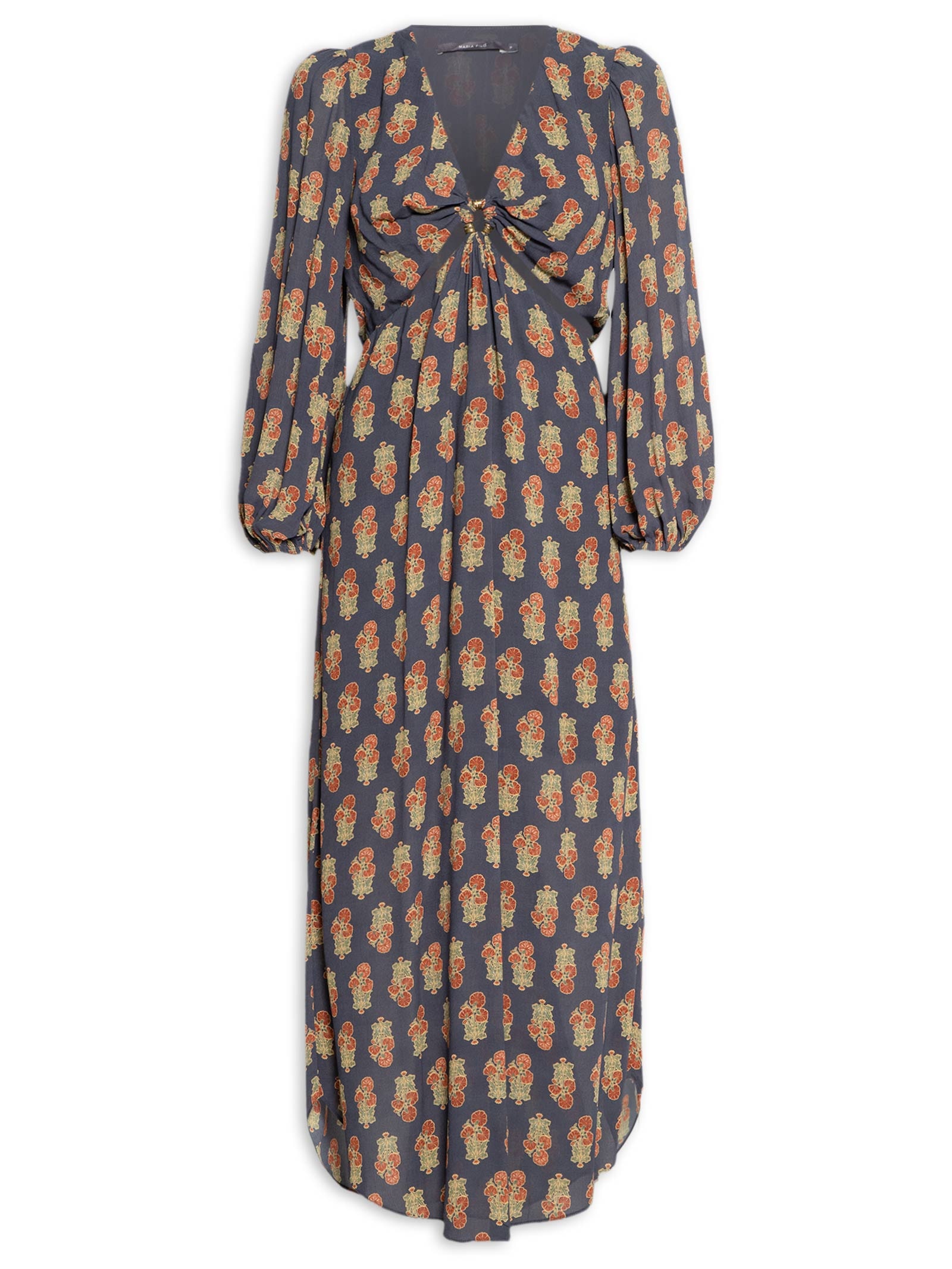 O vestido azul é confeccionado em crepe sem elasticidade. A peça solta ao corpo possui decote V, mangas longas com elástico embutido nos punhos, recortes frontais e laterais vazados na altura da cintura com aplicação central de aviamentos metalizados, estampa floral em cores contrastantes, forro, barra arredondada e comprimento midi.