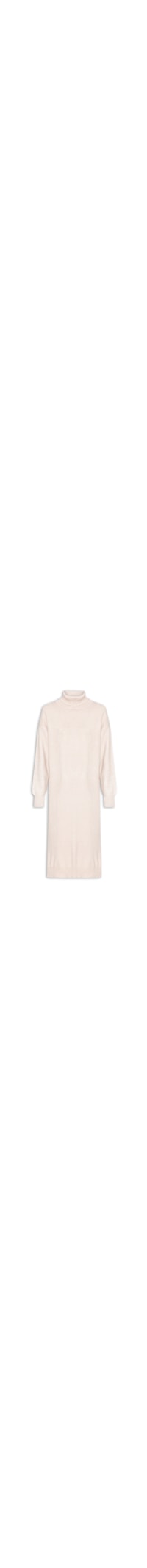 O vestido bege é confeccionado e tricot com alta elasticidade. A peça solta ao corpo possui gola alta com acabamento canelado, mangas longas com acabamento canelado nos punhos, fendas laterais e comprimento midi.