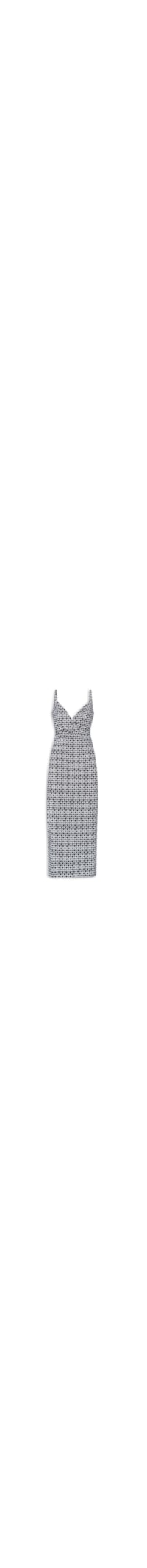 O vestido preto é confeccionado em tecido leve sem elasticidade. A peça solta ao corpo possui decote V transpassado, alças finas reguláveis, recorte frontal vazado na altura da cintura, fenda posterior, estampa de gravataria com fundo branco, comprimento midi e fechamento posterior por zíper invisível.