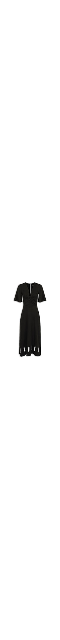 O vestido preto é confeccionado em linho misto. A peça solta ao corpo possui decote profundo em U, mangas curtas, efeito franzido na parte frontal, recortes vazados na parte posterior e na altura da barra, comprimento midi e fechamento posterior por botão e zíper.