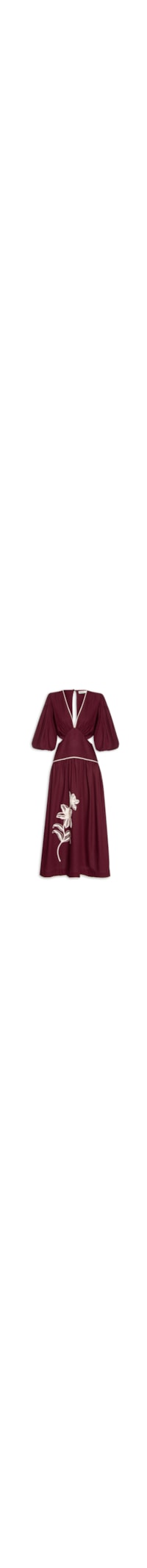 O vestido vinho é confeccionado em tecido leve com toque de linho sem elasticidade. A peça solta ao corpo possui decote V profundo, mangas 3/4 bufantes, recorte posterior vazado com fechamento por botão, recortes laterais vazados, recorte na altura do quadril, mix de bordados na cor bege, comprimento midi e fechamento posterior por zíper invisível.