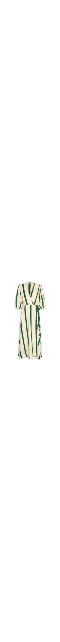 O vestido verde é confeccionado por tecido leve com toque em linho. A peça solta ao corpo possui decote V transpassado, mangas 3/4 com elástico embutido nos punhos, recorte frontal sobreposto com cordão embutido para amarração, padronagem listradas em cor contrastante e comprimento midi.
