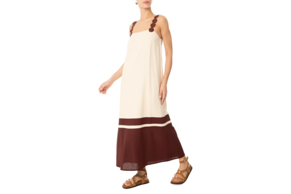 O vestido bege é confeccionado em tecido leve com toque de linho sem elasticidade. A peça justa no busto e na cintura e solta ao corpo possui decote redondo, alças médias, cavas regulares, faixa média na parte posterior, elástico embutido na faixa e na altura da cintura, forro, comprimento midi e fechamento posterior por zíper.
