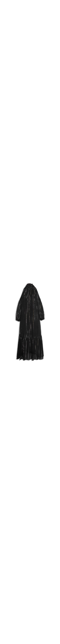 O vestido preto é confeccionado em tecido leve com fios de lurex metalizados e sem elasticidade. A peça solta ao corpo possui gola alta com lastex aplicado, recorte vazado nos ombros estendido para as mangas, mangas longas com elástico embutido na barra, recorte com efeito franzido, forro, comprimento midi e fechamento posterior em recorte vazado com botão aplicado.