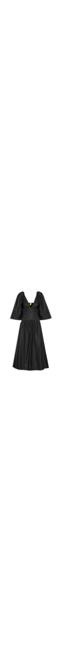 O vestido preto é confeccionado em tecido leve sem elasticidade. A peça solta ao corpo possui decote V profundo, mangas 7/8 bufantes, recorte posterior em lastex, recortes frontais, sem bojo, recorte na altura do quadril com franzidos e comprimento midi.