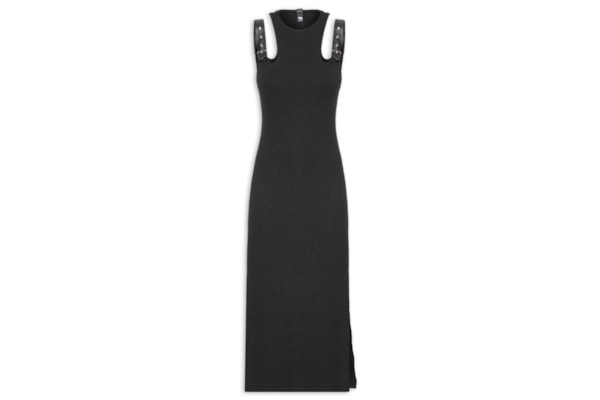 O vestido preto é confeccionado em tecido leve com superfície em paetês de baixa elasticidade. A peça justa ao corpo possui decote reto, alças finas, leve transparência, forro e comprimento midi.