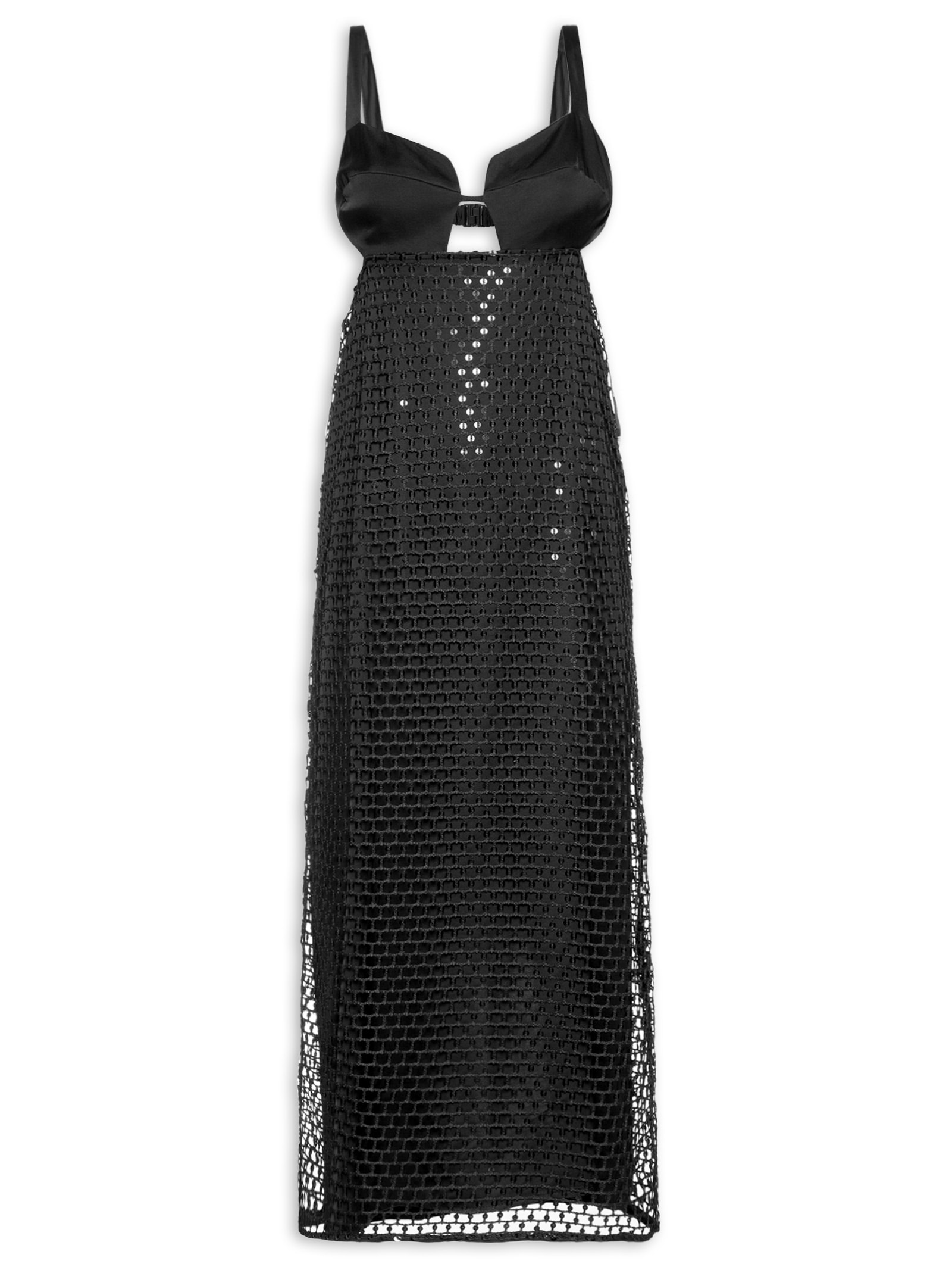 O vestido preto é confeccionado em tecido leve sem elasticidade. A peça solta ao corpo possui decote frontal em V com detalhe de recorte vazado com tira, decote posterior vazado, alças finas reguláveis, fenda posterior, acabamento em renda e paetês, comprimento midi e fechamento posterior por elástico embutido com fecho por encaixe e zíper invisível.