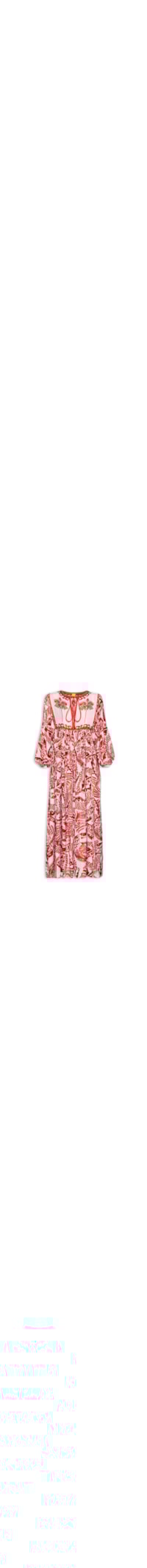O vestido vermelho é confeccionado por tecido leve sem elasticidade. A peça possui decote redondo com recorte em V profundo e tiras aplicadas para amarração, mangas 7/8 com acabamento franzido, detalhes em fios lurex, recorte frontal com acabamento em viés na altura do busto, estampas abstratas em cor contrastante, recorte posterior com acabamento em viés, detalhes franzidos posteriores e comprimento longo.