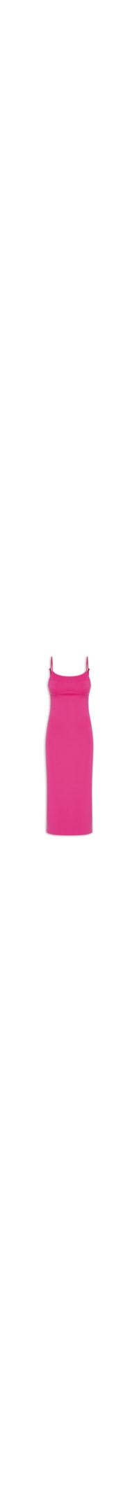 O vestido rosa é confeccionado em malha. A peça possui decote reto, alças finas com regulador, recorte na região frontal do busto, tag metálica com nome da marca na região posterior, fenda na região posterior, barra com corte a fio, comprimento midi e shape solto.