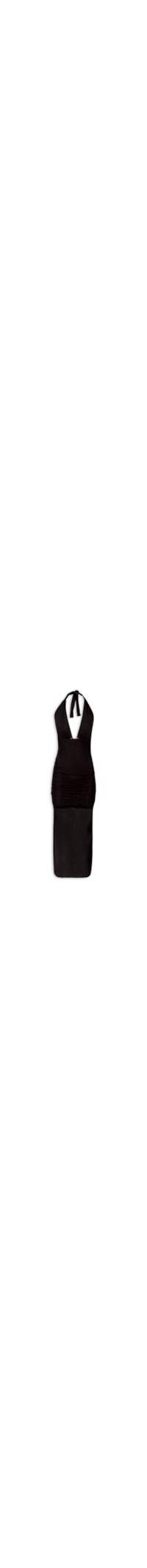 O vestido preto é confeccionado em tule com alta elasticidade. A peça justa ao corpo de modelo frente única possui decote em V profundo com detalhe metálico, forro, comprimento midi e fechamento posterior por amarração da altura da nuca.