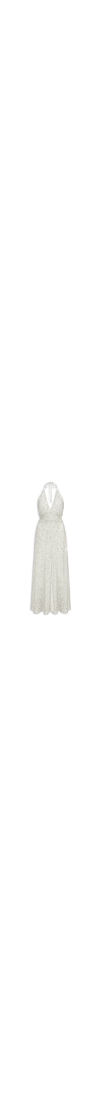 O vestido branco é confeccionado em tecido leve com toque de seda, A peça solta ao corpo possui decote V profundo, alças finas duplas alongadas com detalhe metalizado nas ponteiras, recortes com efeito de babado na altura da cintura, tecido sobreposto na parte frontal, fenda frontal, padronagem poá em cor contrastante, comprimento midi e fechamento posterior por amarração.