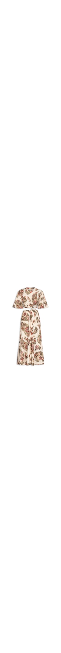 O vestido amarelo é confeccionado por tecido leve sem elasticidade. A peça solta ao corpo possui decote arredondado, mangas 3/4 amplas, recorte na altura da cintura com efeito de torção, estampa figurativa floral em cor contrastante e comprimento midi.