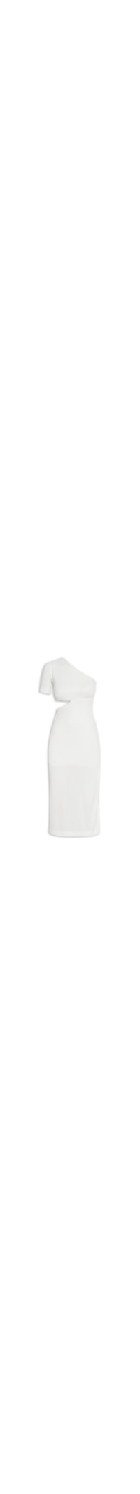 O vestido off white é confeccionado em malha. A peça modelo ombro único possui manga curta, cava regular, recorte vazado na altura da cintura, fenda lateral, tag metalizada da marca aplicada na altura das costas, comprimento midi, shape justo, caimento reto, forro e acabamento pespontado.