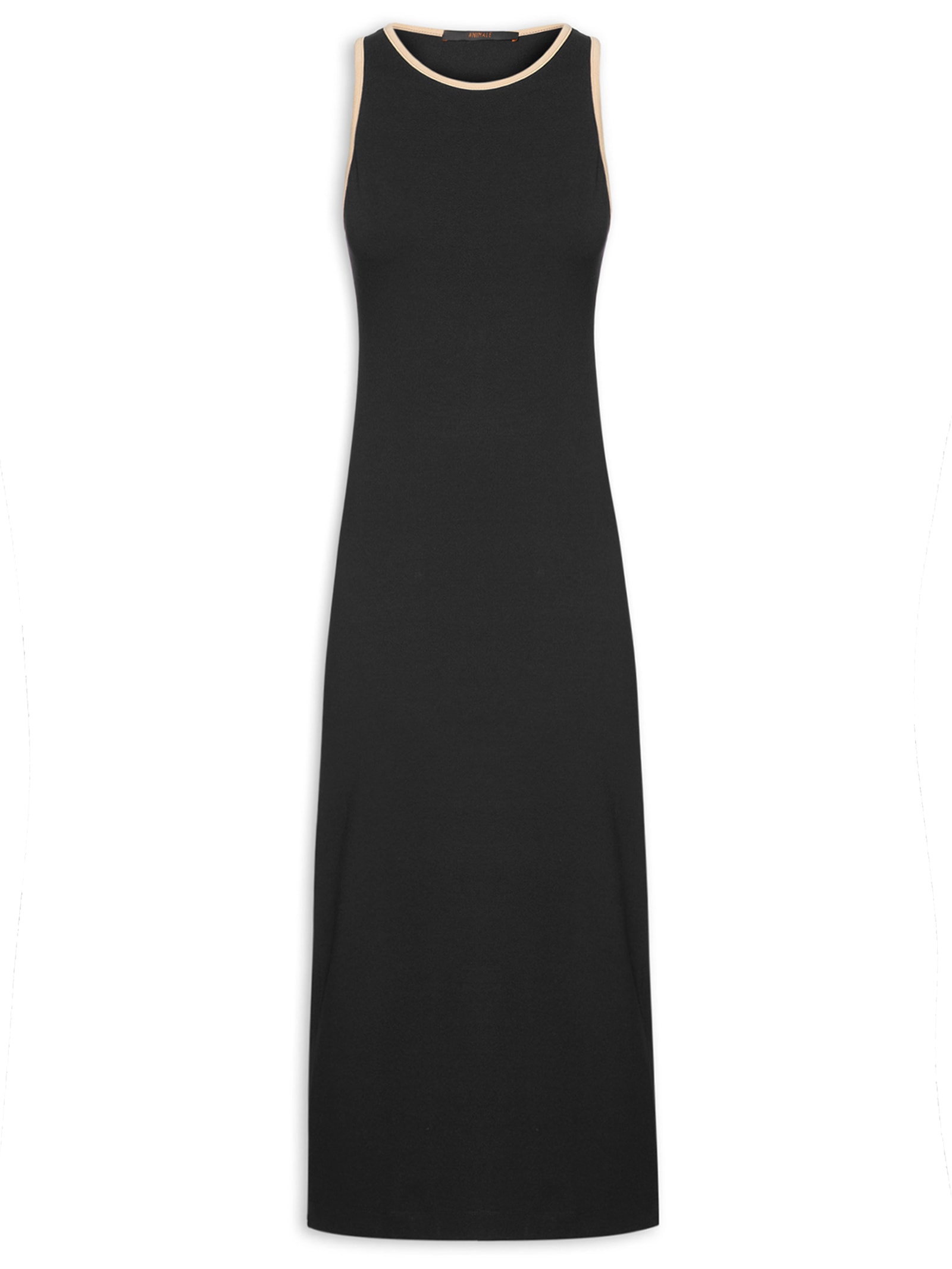 O vestido preto é confeccionado em tecido leve com média elasticidade. A peça justa ao corpo possui decote frontal redondo, cava americana com recorte posterior nadador, alças médias e comprimento midi.
