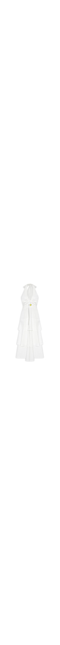 O vestido off white é confeccionado em tecido leve com toque de linho. A peça de modelo frente única possui decote V profundo com detalhe de nó frontal, alças largas para amarração posterior, cavas regulares, recorte frontal vazado, recorte posterior em lastex, recorte na altura da cintura, babados sobrepostos no comprimento, comprimento longo e shape solto.
