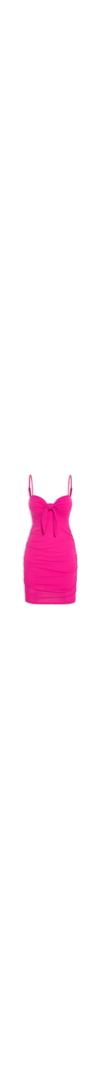 O vestido rosa é confeccionado em malha texturizada. A peça possui decote coração com faixas estendidas para amarração, alças finas reguláveis, tag da marca aplicada na parte posterior, franzido aplicado nas laterais, shape justo, caimento reto, comprimento curto e acabamento pespontado.
