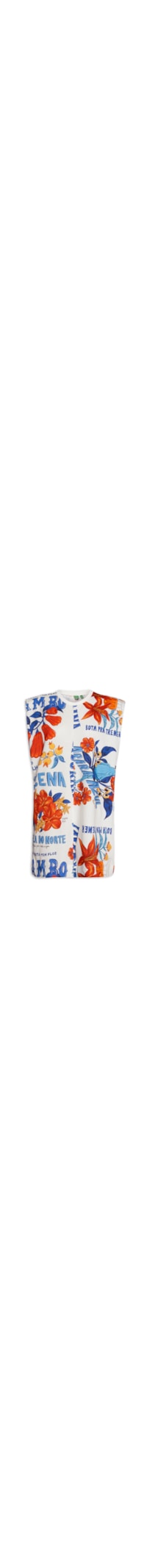 O vestido azul é confeccionado em malha de algodão com baixa elasticidade. A peça solta ao corpo possui decote redondo com acabamento canelado, alças com ombreiras embutidas, recorte frontal, mix de estampas em cores contrastantes, e comprimento curto.