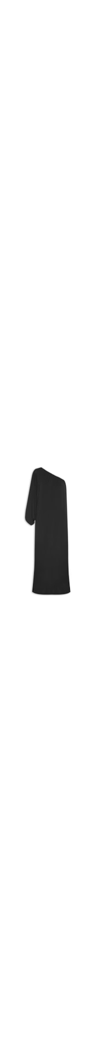 O vestido preto é confeccionado em malha com alta elasticidade. A peça possui decote ombro único com elástico embutido, manga longa modelo raglan bufante, forro, fendas laterais e comprimento midi.