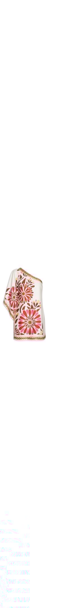 O vestido off white é confeccionado em tecido leve sem elasticidade. A peça de modelo ombro único solta ao corpo possui decote assimétrico, manga 3/4 ampla, pences na altura do busto, forro, mix de estampas em cores contrastantes, comprimento curto e fechamento lateral por zíper invisível.