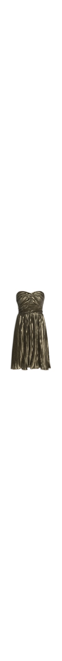 O vestido dourado é confeccionado em malha com fios de lurex e média elasticidade. A peça de modelo tomara que caia justa na altura do busto e solta no comprimento possui decote coração, recorte na altura da cintura, recorte na altura do busto com detalhe de franzido, sem bojo, plissado, forro, comprimento mini e fechamento posterior por zíper.