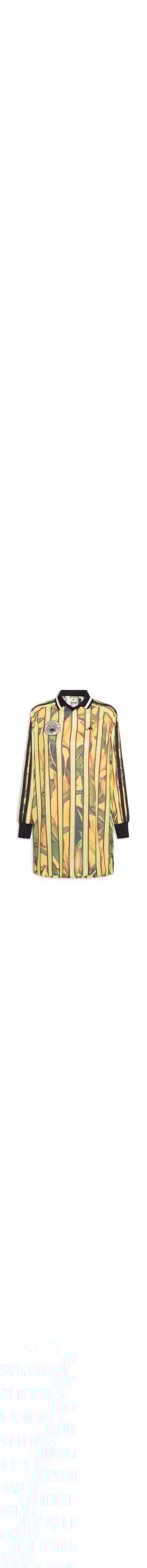O vestido amarelo é confeccionado em malha leve com alta elasticidade. A peça solta ao corpo possui colarinho clássico com detalhe de listra, mangas longas com detalhe de listras na cor preta e punho com acabamento canelado, aplicação numérica na parte posterior, tags na marca aplicadas na parte frontal sendo uma delas em patch, mix de estampas em cores contrastantes e comprimento curto.