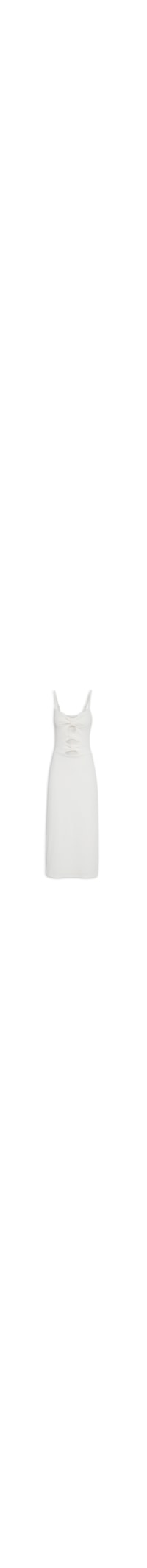 O vestido off white é confeccionado em malha com superfície texturizada e perfurada. A peça possui decote coração, alças finas reguláveis, recortes frontais vazados com franzido aplicado, fenda lateral, forro, shape justo, comprimento midi, caimento reto e acabamento pespontado.