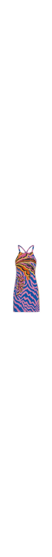 O vestido rosa é confeccionado em malha leve de média elasticidade. A peça justa ao corpo, possui decote trapézio, alças médias com detalhe cruzado posterior, logo da marca estampado na altura do busto em cor contrastante, listras amarelas aplicadas nas laterais, mix de estampas em cores contrastantes e comprimento curto.