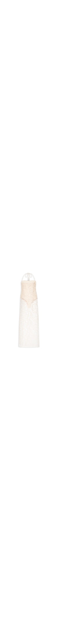 O vestido bege é confeccionado em tule sem elasticidade. A peça solta ao corpo de modelo frente única possui decote quadrado, alças finas reguláveis por amarração posterior, fendas laterais, bordado pasley, transparência e comprimento longo. Acompanha body justo ao corpo para uso opcional de modelo tomara que caia confeccionado em malha com superfície texturizada, decote reto e forro.