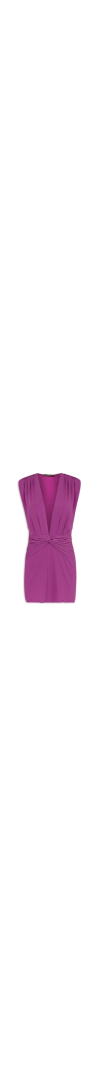 O vestido rosa é confeccionado em malha. A peça solta ao corpo possui decote V profundo, ombros com detalhe franzido, cavas estendidas, recorte sobreposto na parte frontal com detalhe e nó, recorte posterior com elástico embutido e comprimento curto.