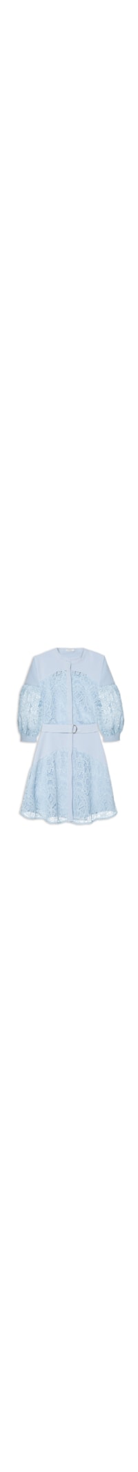 O vestido azul é confeccionado em renda sem elasticidade. A peça justa na altura da cintura e solta no comprimento possui gola alta, mangas 3/4 bufantes com abotoamento nos punhos, recortes posteriores e frontais em tecido leve, forro, passantes nas partes laterais na altura da cintura, pences na parte posterior, transparência, comprimento curto e fechamento frontal por botões com vista sobreposta. Acompanha cinto no mesmo tecido e cor.