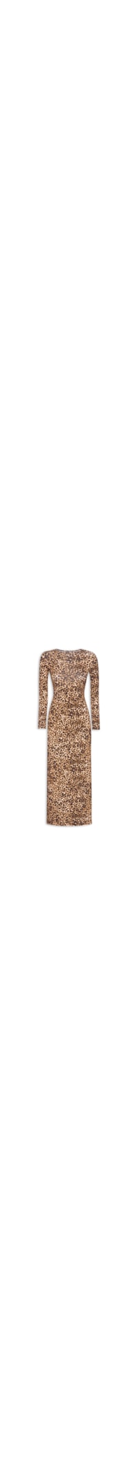 O vestido animal print é confeccionado em malha leve com alta elasticidade. A peça justa ao corpo possui decote redondo com tag metalizada da marca aplicada na parte posterior, mangas longas, recorte posterior vazado com argola metalizada embutida e detalhes de franzidos, fenda posterior e comprimento midi.