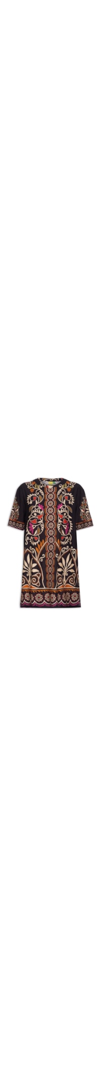 O vestido preto é confeccionado em tecido leve sem elasticidade. A peça solta ao corpo decote redondo, mangas curtas, mix de estampas em cores contrastantes e comprimento curto.