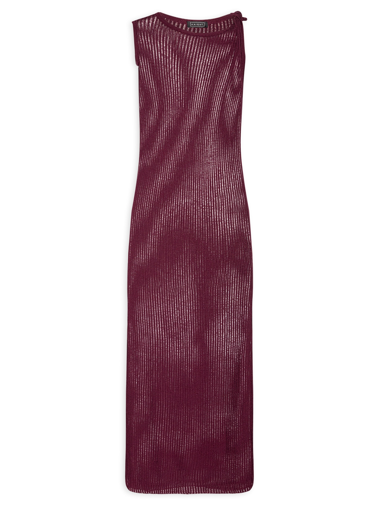 O vestido vinho é confeccionado em tricot com superfície canelada de alta elasticidade. A peça solta ao corpo possui decote canoa, alças largas sendo uma com detalhe de torção, cavas estendidas, transparência, sem forro e comprimento midi.
