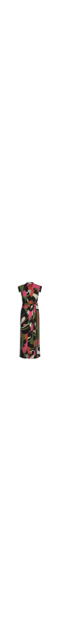 O vestido verde é confeccionado em tecido leve com toque de linho. A peça possui decote V profundo transpassado, mangas curtas, passantes aplicados nas partes laterais na altura da cintura, bolsos frontais modelo faca, recorte frontal com fenda, estampa abstrata em cores contrastantes, comprimento longo, shape solto e fechamento frontal por botões de pressão. Acompanha faixa no mesmo tecido e cor.