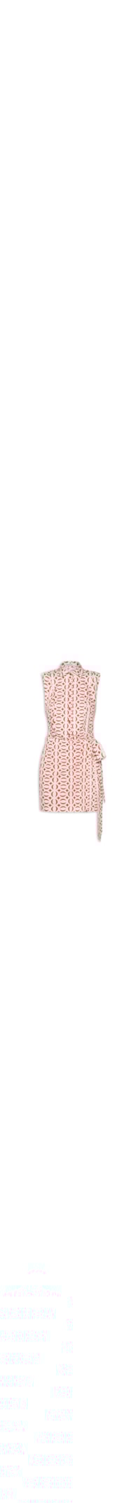 O vestido vermelho é confeccionado em tecido leve sem elasticidade. A peça solta ao corpo possui colarinho clássico, alças largas, cavas regulares, recorte na altura da cintura com elástico embutido na parte posterior, estampa figurativa de cobogós na cor bege, sobreposição frontal com faixas alongadas na altura da cintura para amarração lateral, comprimento curto e fechamento frontal por botões e lateral por zíper invisível.