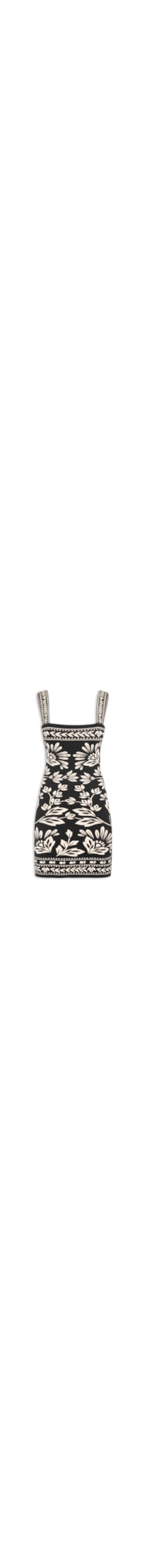 O vestido preto é confeccionado em tricot com média elasticidade. A peça justa ao corpo possui decote reto, alças médias, mix de estampa em cor contrastante e comprimento curto.