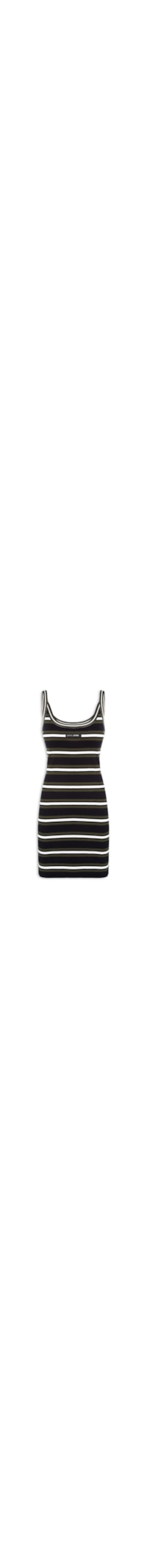 O vestido preto é confeccionado em tricot em média elasticidade. A peça justa ao corpo possui decote arredondado, alças finas, detalhes em pesponto branco na área do busto, estampa listrada em cores contrastantes, aplicação de tag da marca na parte frontal e posterior e comprimento curto.