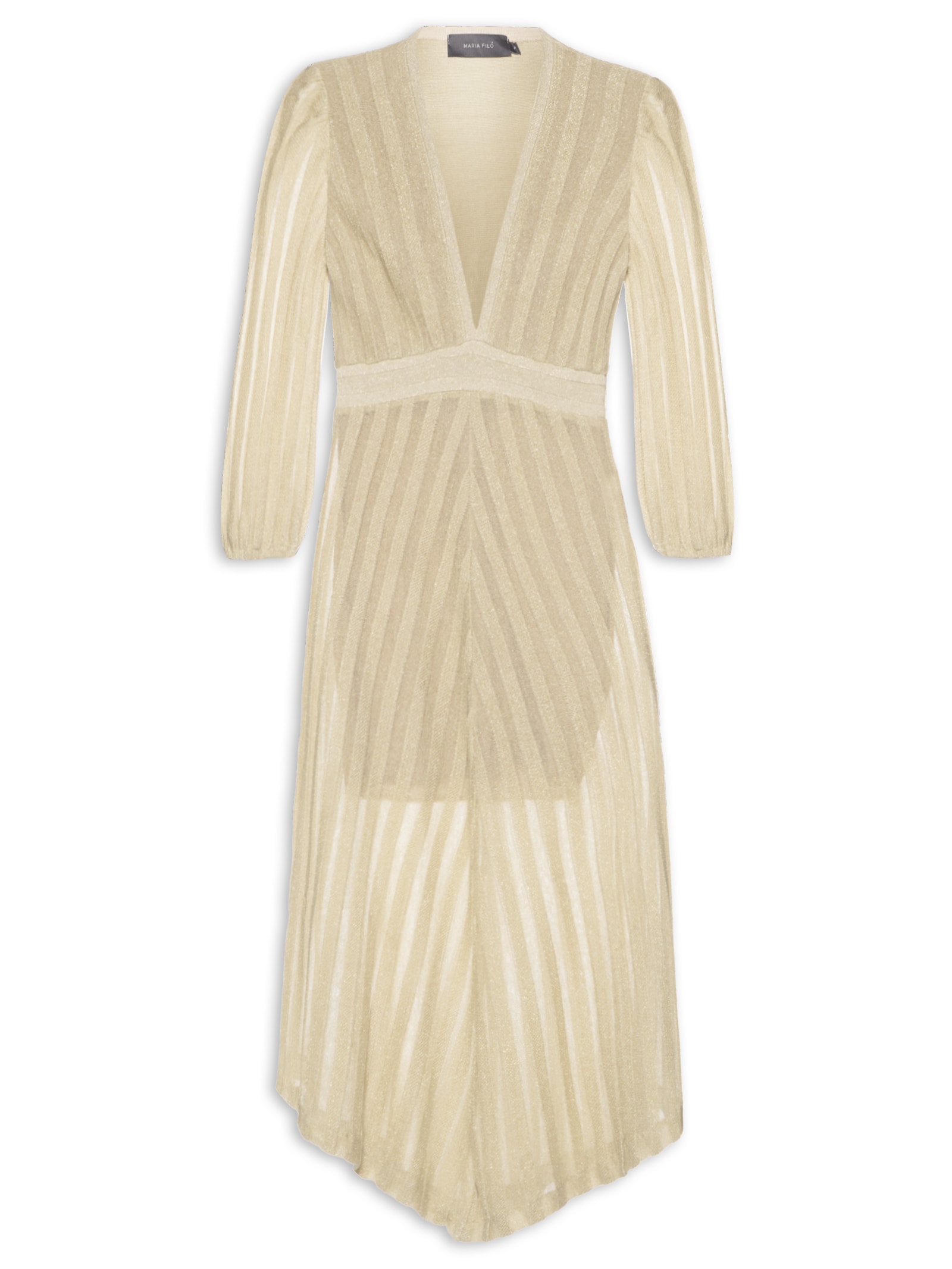 O vestido dourado é confeccionado em tricot com alta elasticidade. A peça solta ao corpo possui decote em V, mangas 3/4 com elástico embutido nos punhos, padronagem de listras em 3D, barra assimétrica, leve transparência, forro curto e comprimento midi.