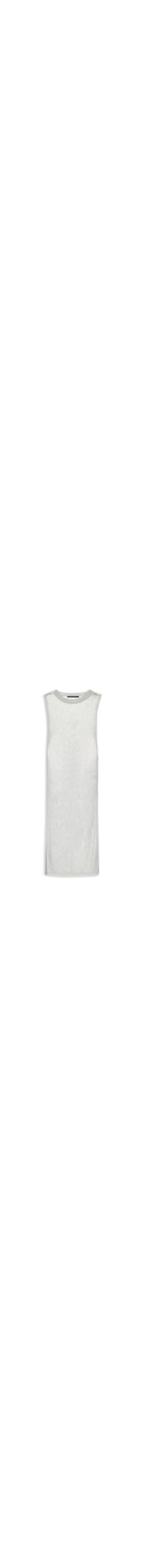 O vestido prata é confeccionado em tricot com superfície metalizada A peça possui decote redondo, cavas estendidas, fendas laterais, leve transparência, comprimento midi e shape solto.