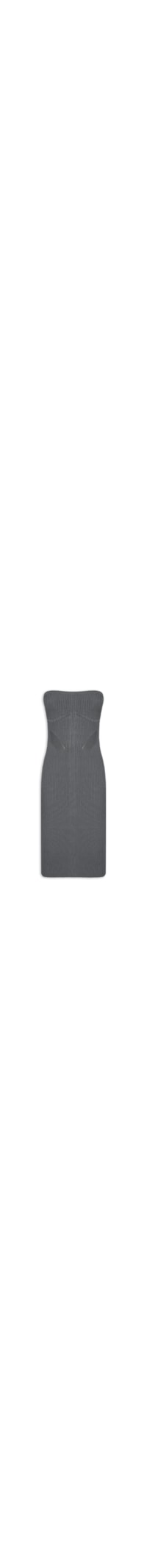 O vestido cinza é confeccionado por tricot com superfície canelada e alta elasticidade. A peça justa ao corpo de modelo tomara que caia possui decote reto, recortes frontais e comprimento midi.