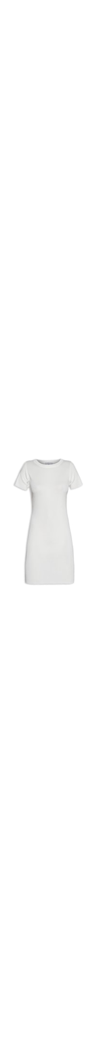 O vestido off white é confeccionado em tricot com alta elasticidade. A peça justa ao corpo possui decote redondo, mangas curtas, recorte posterior vazado com detalhe de amarração com cordão de superfície de strass, comprimento curto e acabamento canelado.